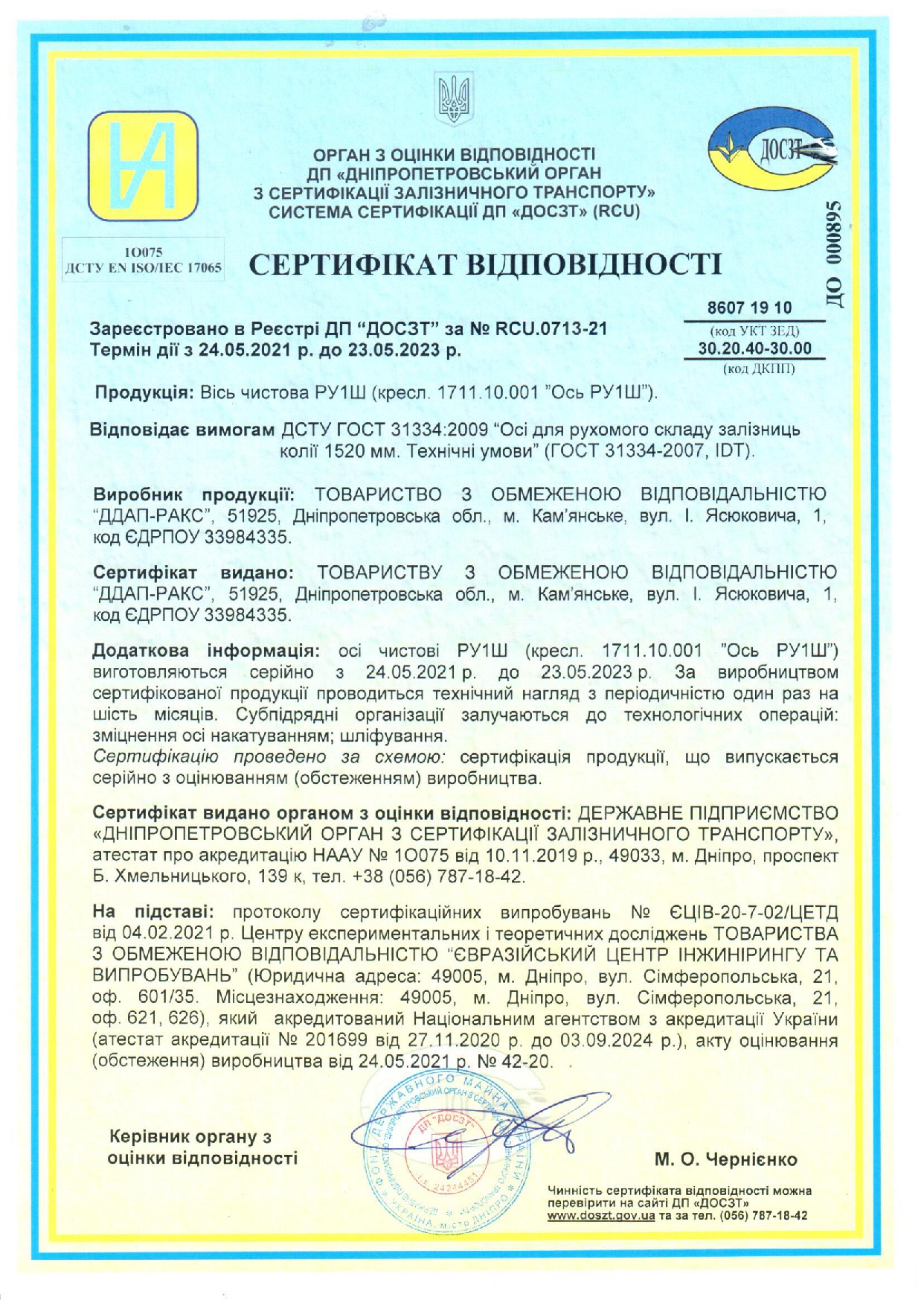 In May 2021, the Conformity Assessment Body DP “Dnipropetrovsk Railway Certification Body” carried out certification of the finished axle РУ1Ш, which is serially manufactured with production inspection.