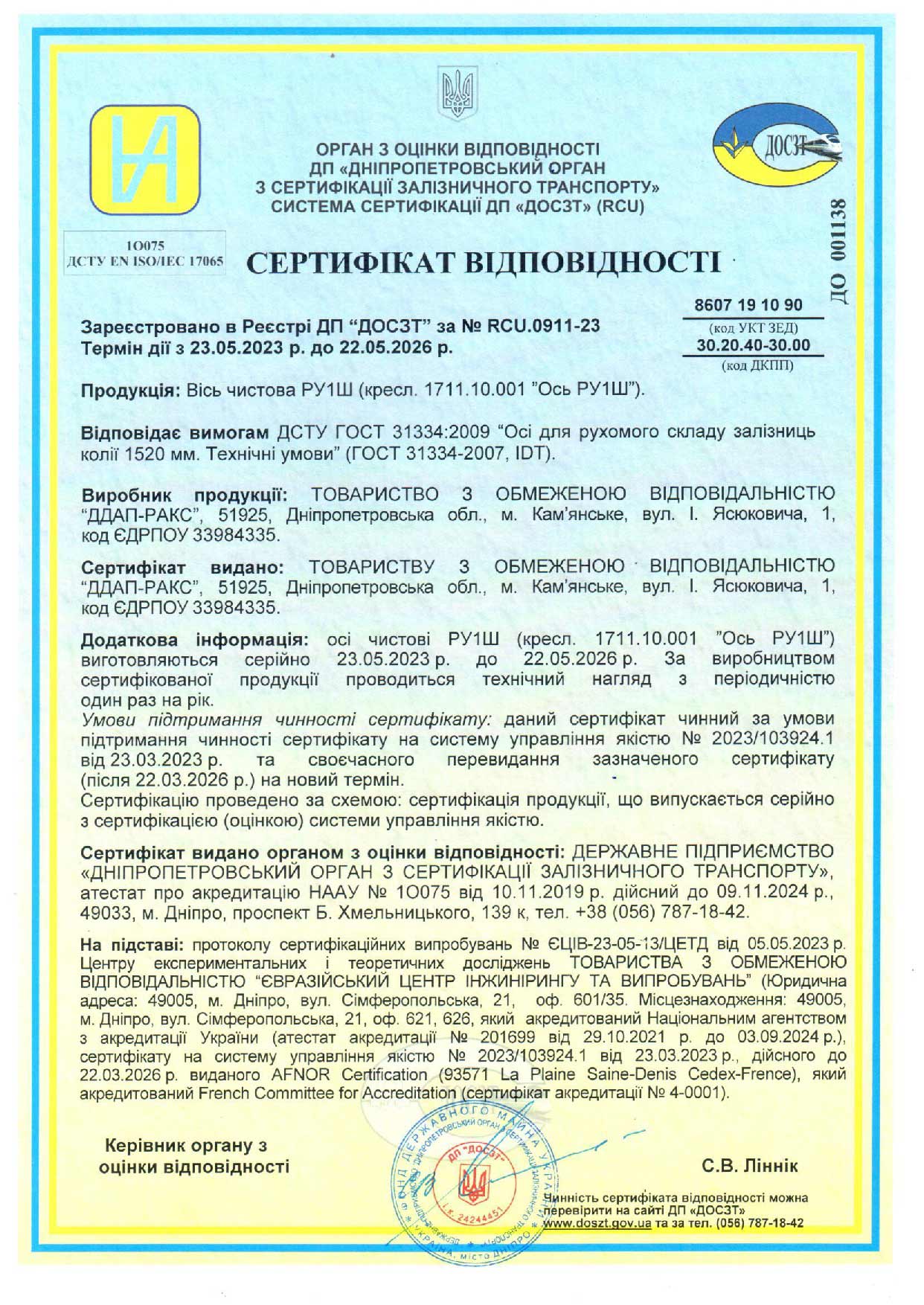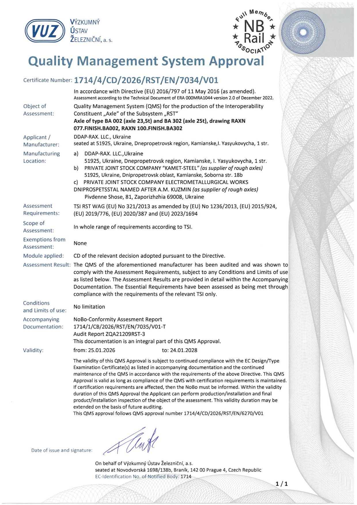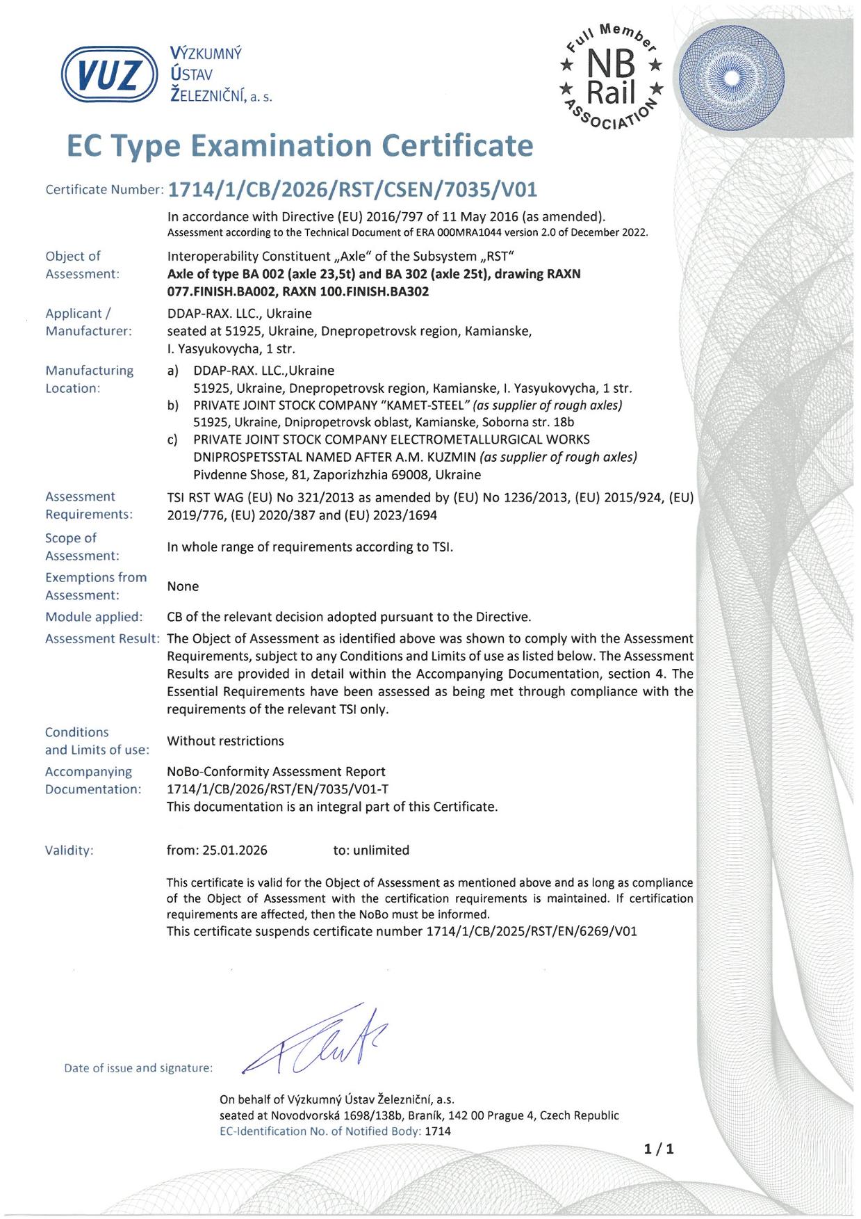 ДДАП-РАКС отримує сертифікати відповідності чистових осей BA 002 (вісь 23,5 т) і BA 302 (вісь 25 т) вимогам РЕГЛАМЕНТУ КОМІСІЇ (ЄС)...